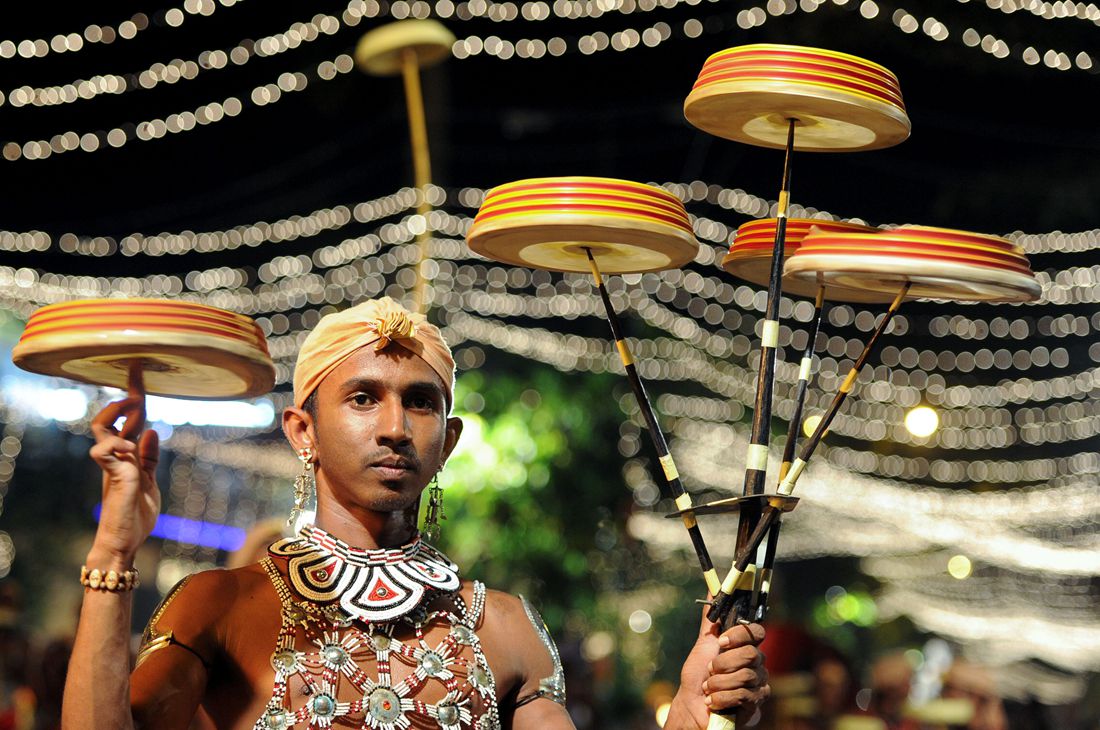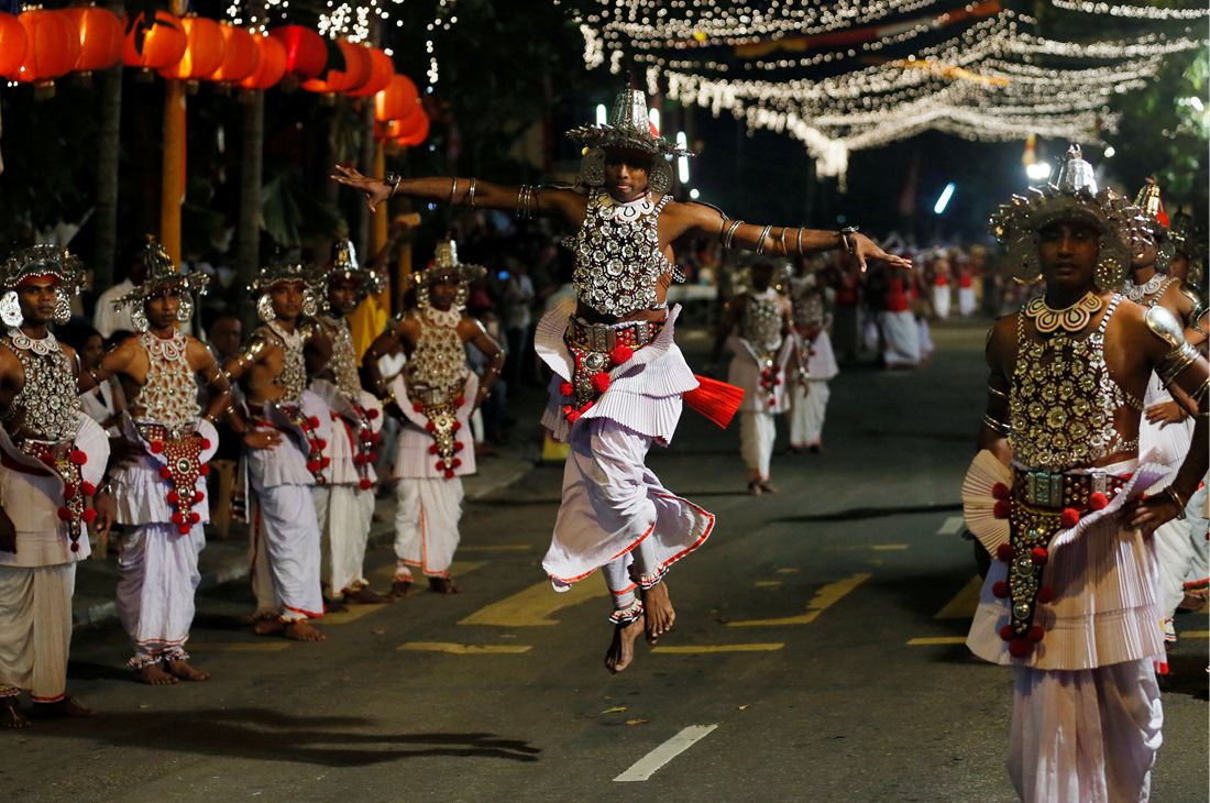 A man performs a traditional Sri Lankan dance in a procession in front of the Gangaramaya Temple during the Navam Perahera festival in Colombo on February 9, 2017. Photo: Lakruwan Wanniarachchi/CFP figcaption >