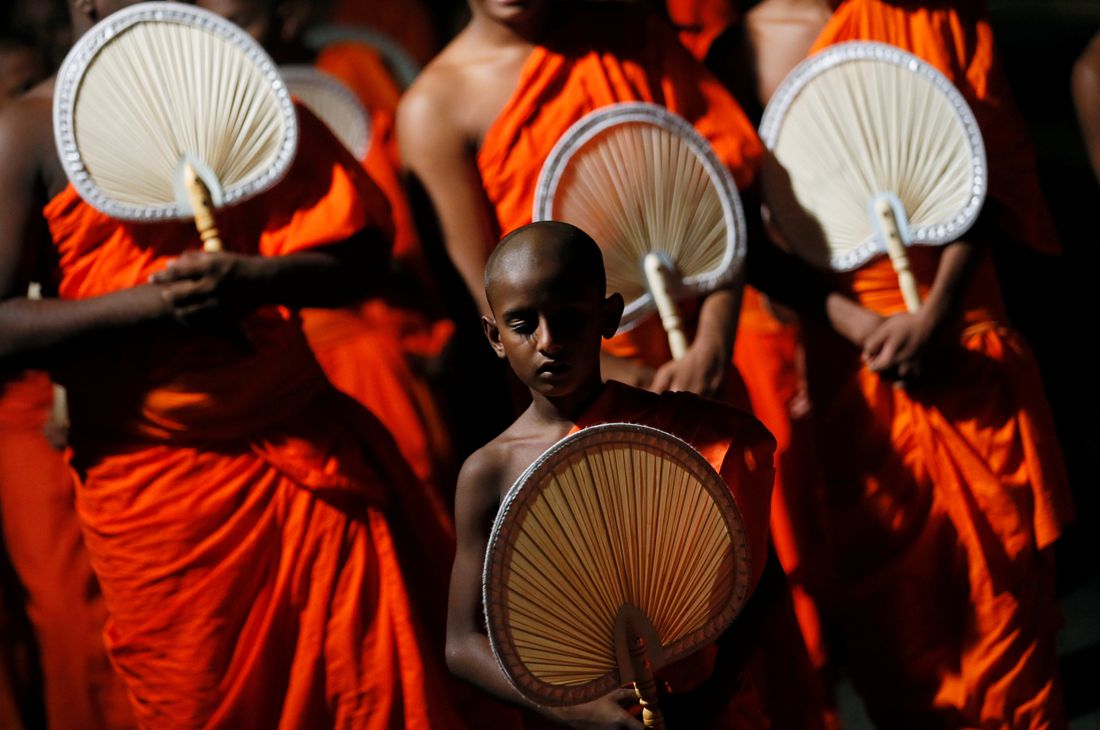Sri Lankan Buddhist monks walk along a street during the Navam Perahera festival in Colombo on February 9, 2017. Photo: Lakruwan Wanniarachchi/CFP figcaption >