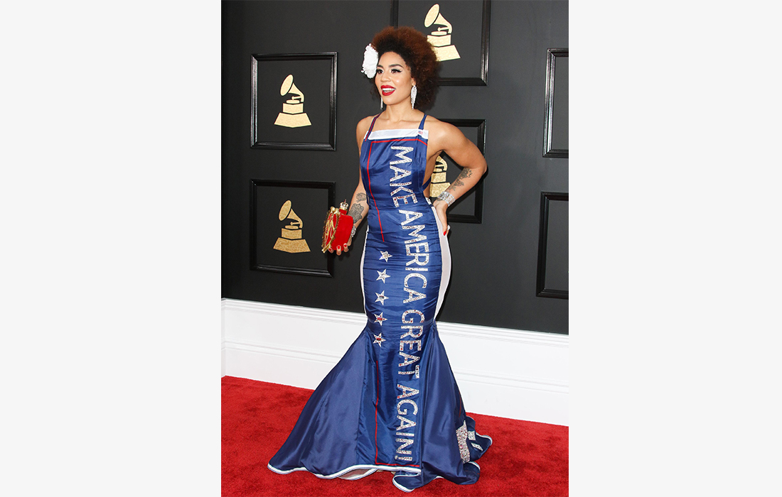 Singer Joy Villa poses for photos at the 59th Grammy Awards in a gown emblazoned with US President Trump's campaign slogan 'make America great again' at the Staples Center in Los Angeles, California on February 12, 2017. Photo: CFP/JC Olivera