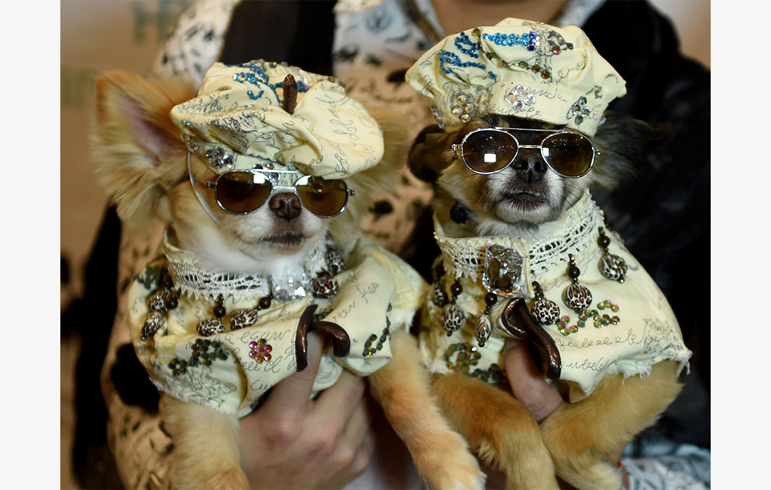 Two dogs sporting the finest in furry French fashion pose for photos at the 14th Annual New York Pet Fashion Show on February 9. Photos: Timothy A. Clary/CFP