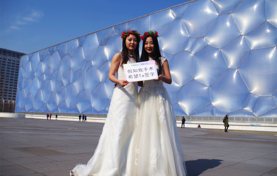 A lesbian couple in wedding dresses pose for a photo in front of the Imperial College in Beijing on February 13. figcaption >