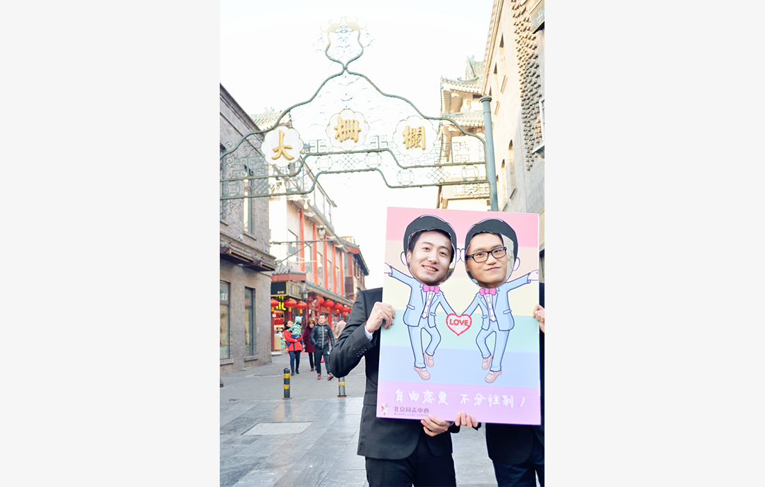 A gay couple pose for a photo at Dashilan, a famous business street in Beijing on February 13. figcaption >