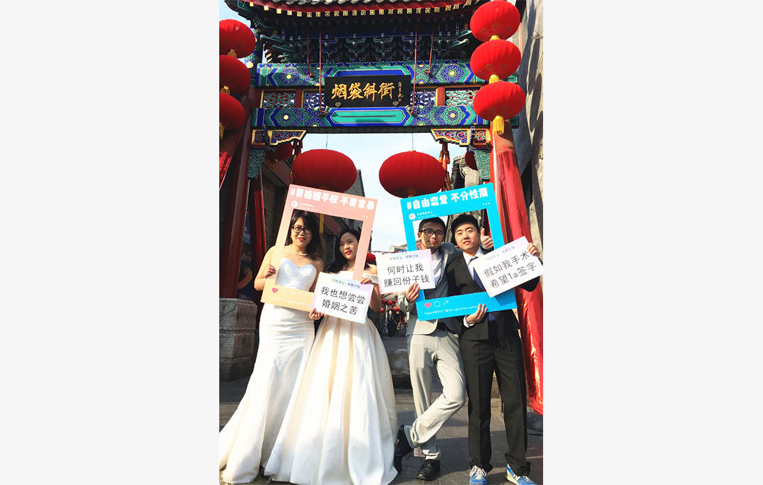 LGBTIQ couples pose for photos in front of Beijing landmarks on February 13. The Beijing LGBT Center organized the shoot on the eve of Valentine’s Day as a call for marriage equality for the LGBTIQ community. Photos: Courtesy of the Beijing LGBT Center