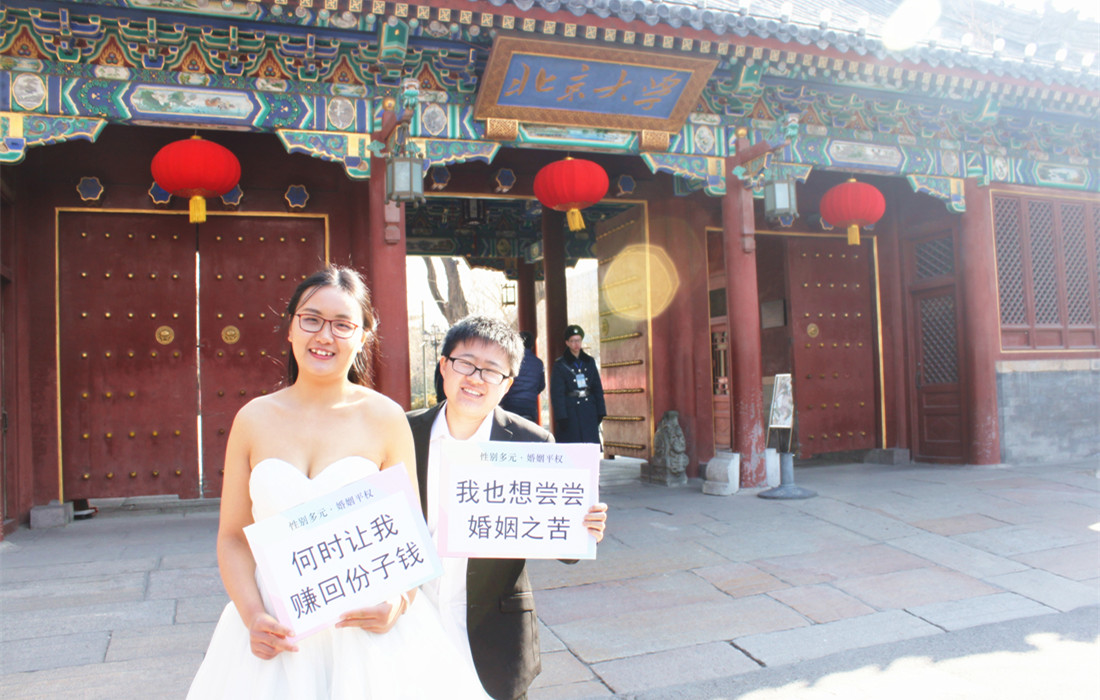 An LGBTIQ couple pose for a photo with the slogan “I want to get married” in front of Peking University on February 13. figcaption >