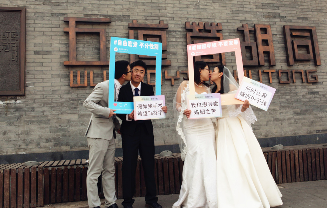 Two LGBTIQ couples pose for a photo at Wudaoying Hutong in Beijing on February 13. figcaption >