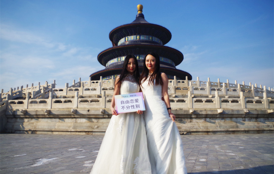 A lesbian couple pose for a photo with the slogan “free love isn’t defined by gender” in front of the Temple of Heaven on February 13.