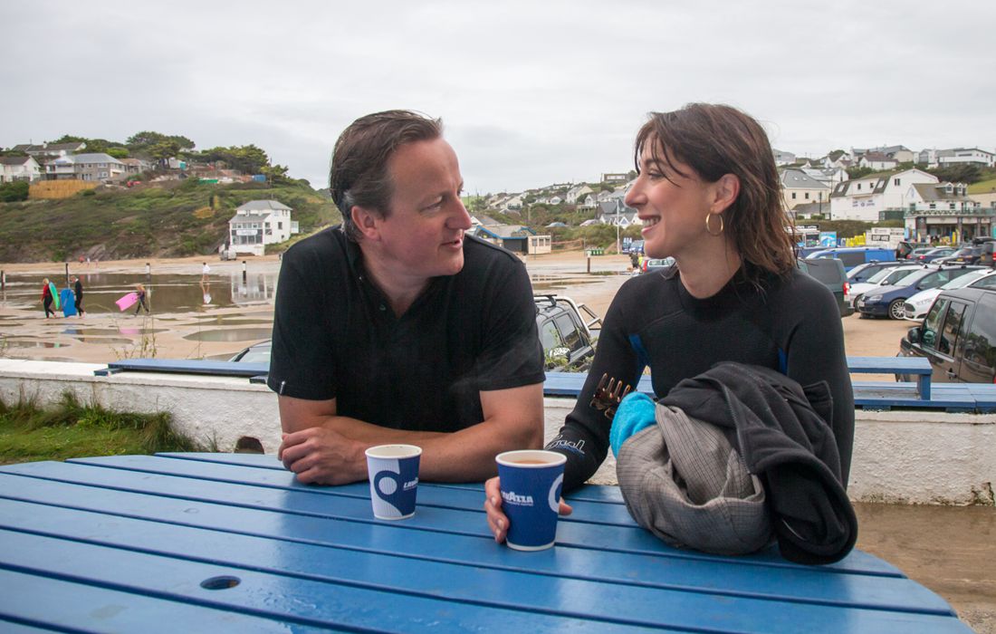 Former British Prime Minister David Cameron and his wife Samantha have a coffee outside the Galleon Beach Cafe following an early morning swim in the sea during his holiday in the small seaside resort of Polzeath on August 23, 2015 in Cornwall, England. Photo: Matt Cardy /WPA Pool/Getty Images/CFP figcaption >