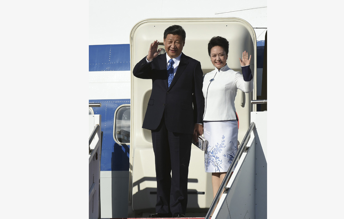 Chinese President Xi Jinping and his wife Peng Liyuan wave upon their arrival in Seattle, September 22, 2015. Xi arrived for a state visit to the US. Photo: Xinhua figcaption >