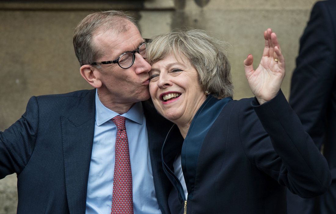 Britain's then new Conservative Party leader Theresa May (right) receives a kiss from her husband Philip John May (left), after speaking to members of the media at The St Stephen's entrance to the Palace of Westminster in London on July 11, 2016. Photo: CFP figcaption >