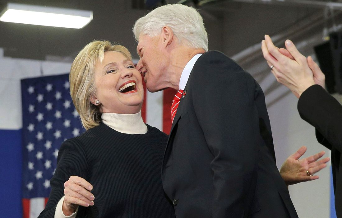 Democratic US presidential candidate Hillary Clinton receives a kiss from her husband, former US President Bill Clinton, as she speaks to supporters at her final 2016 New Hampshire presidential primary night rally in Hooksett, New Hampshire February 9, 2016. Photo: Brian Snyder/ CFP figcaption >