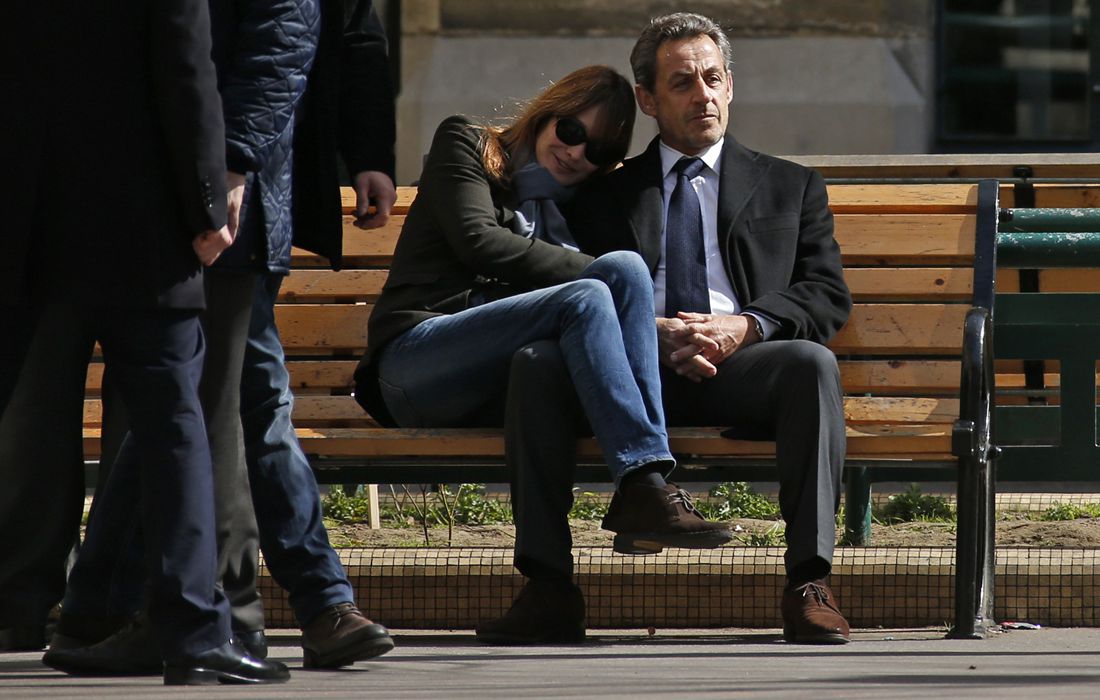 Former French President Nicolas Sarkozy (right) sits on a bench with his wife and singer Carla Bruni-Sarkozy after voting at a polling station in the first round in the French mayoral elections in Paris on March 23, 2014. Photo: Benoit Tessier/ CFP figcaption >