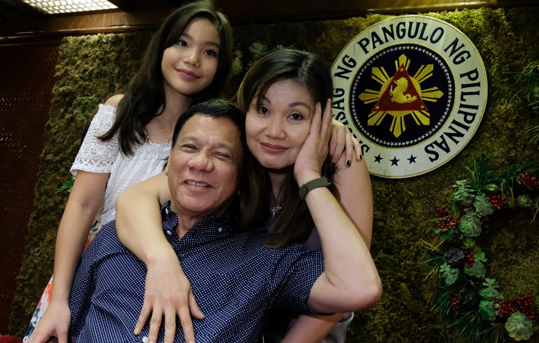 Philippine President Rodrigo Duterte, his common-law wife Honeylet Avancena (right) and their daughter Veronica pose for a photograph during a Christmas party at Malacanang Palace in Manila, Philippines on December 20, 2016. Photo: CFP figcaption >