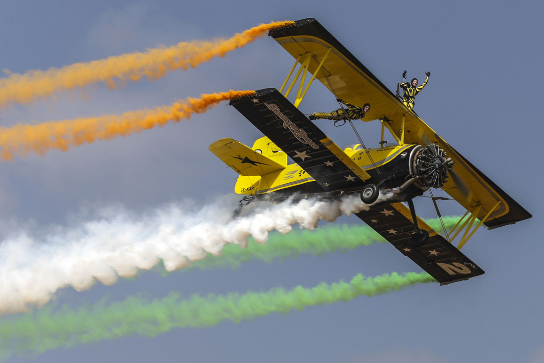 Wing walkers perform stunts on a biplane during an flying display at the Aero India show at Air Force Station Yelahanka in Bengaluru, India, on Tuesday, Feb. 14, 2017.Photo:CFP/Dhiraj Singh/Bloomberg via Getty Images figcaption >