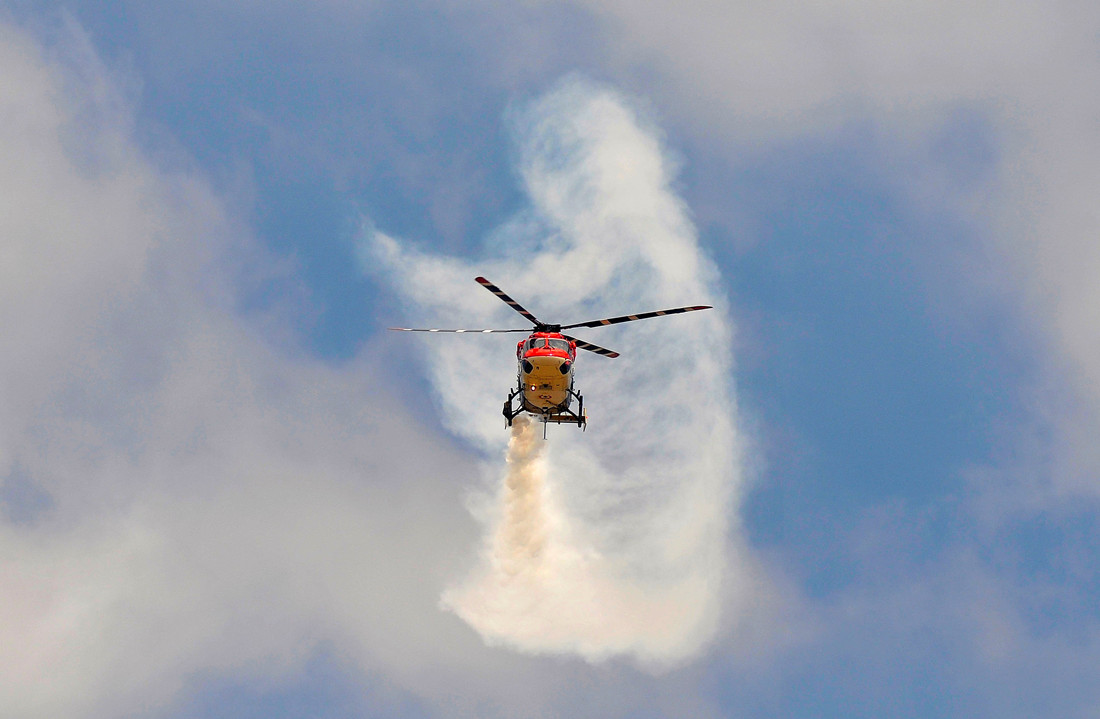 The Indian Air Force Sarang helicopter flies during the inauguration of Aero India show at the Yelahanka Air Force Station in Bengaluru, India, February 14, 2017.Photo: CFP/Abhishek N. Chinnappa figcaption >