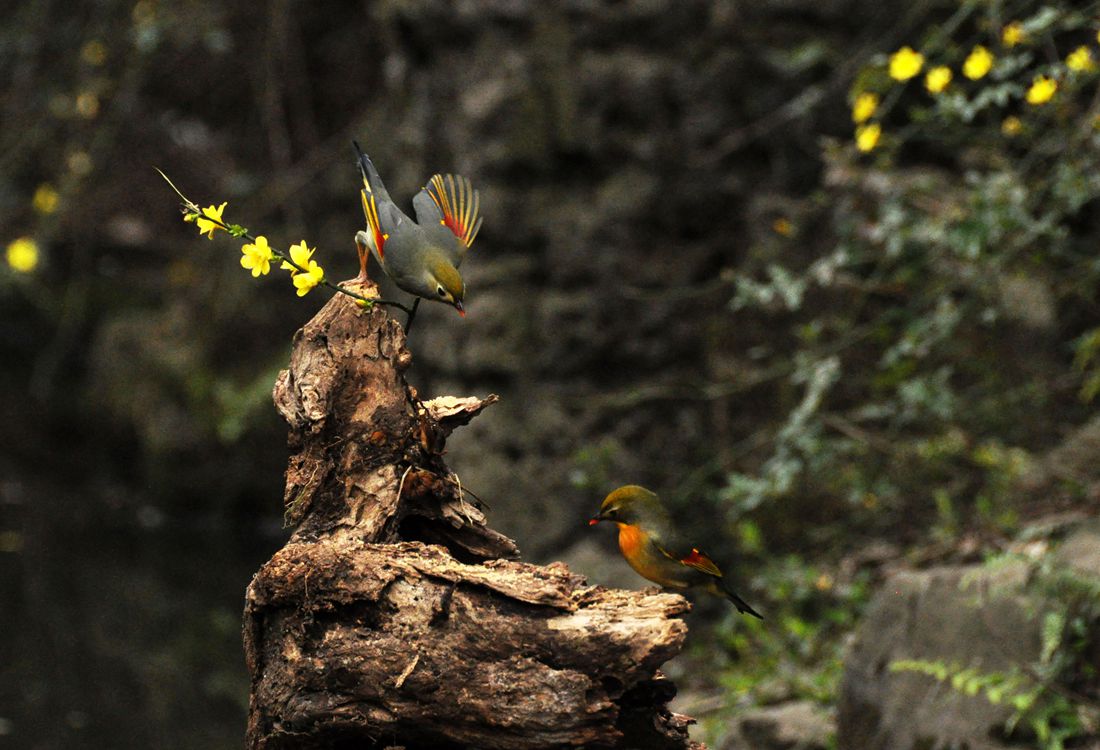 A couple of white-eyes look for food at Qianlingshan Park in Qiandongnan Miao and Dong Autonomous Prefecture, Guizhou Province on February 15, 2017. Photo: CFP figcaption >