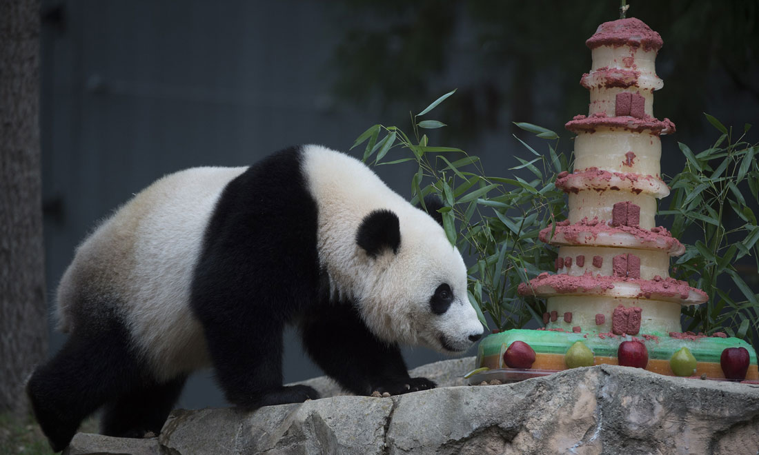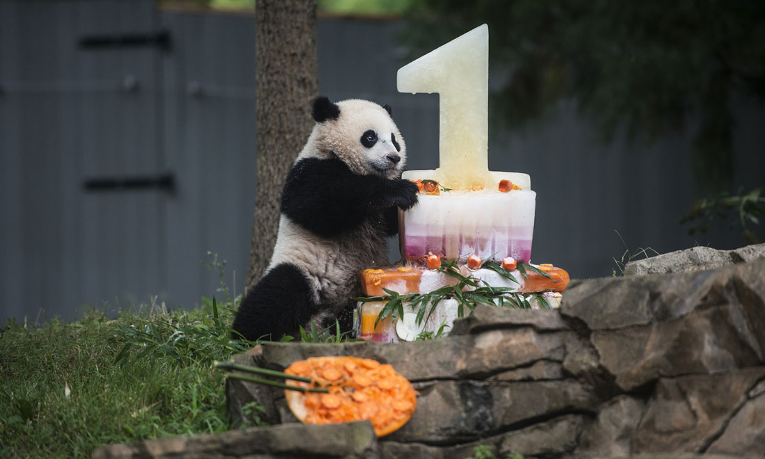 Baobao poses with her cake on her first birthday at the National Zoo in Washington, US on August 23, 2014. figcaption >