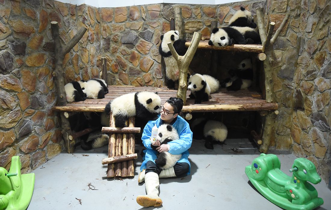 Zhang Yue feeds panda cubs at Chengdu Research Base of Giant Panda Breeding in China's Sichuan Province on January 13, 2017. Photo: CFP figcaption >