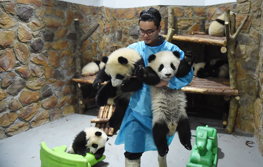 Zhang Yue carries two panda cubs at Chengdu Research Base of Giant Panda Breeding in China's Sichuan Province on January 13, 2017. Photo: CFP figcaption >