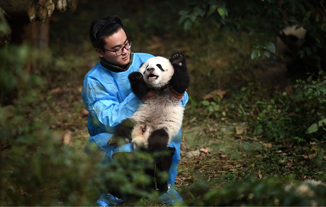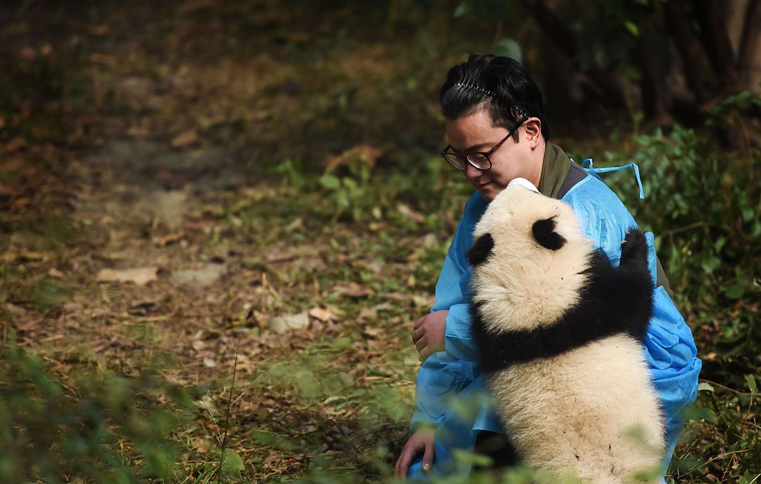 Zhang Yue takes a panda cub outside at Chengdu Research Base of Giant Panda Breeding in China's Sichuan Province on January 13, 2017. Photo: CFP figcaption >