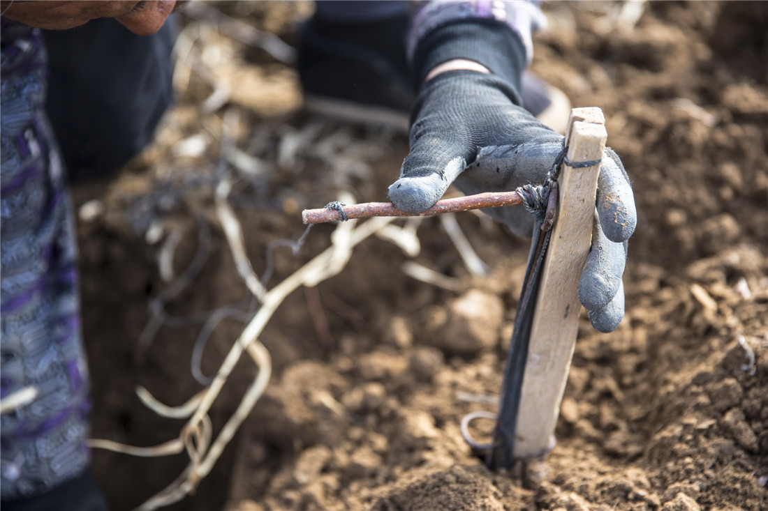Li sets up his handmade rodent traps on March 18, 2015 in Yan'an, Shaanxi Province. The traps are mini crossbows set up above a tunnel that shoot a spike downward when a rodent disturbs the soil underneath. Li often works during warm weather as zokors are rarely active on cold and rainy days. Photo: CFP figcaption >
