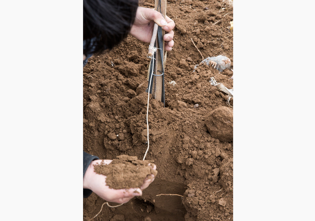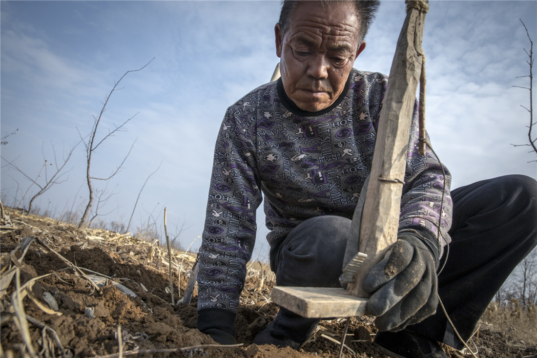 Li works in a field on March 18, 2015 in Yan'an, Shaanxi Province. Li first checks the ground for swells on the soils surface from burrowing rodents underneath. "Just like snakes have paths, mice also have their own," said Li, "The first step is to spot their paths." According to Li, rodents usually dig more than one entrance, but he can identify which ones are the most used at a glance. Photo: CFP