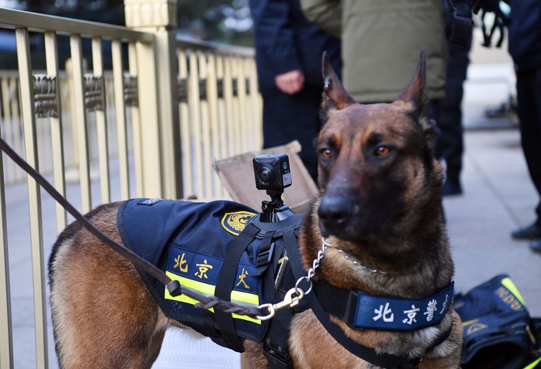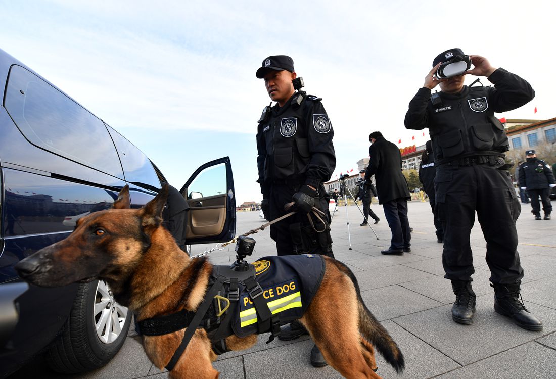 A police dog harnessed with a VR recording device stands on patrol with its police handler at Tiananmen Square in Beijing, China on March 5, 2017. Photo: CFP figcaption >
