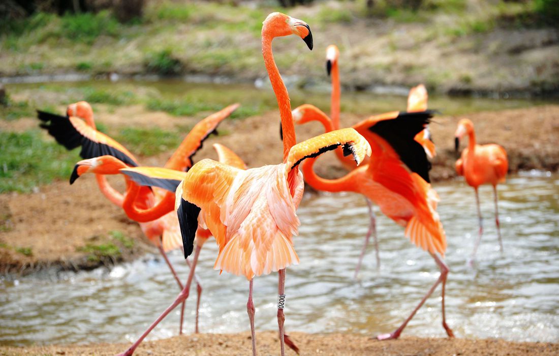 Flamingos enjoy the spring sun at Qingdao wildlife park