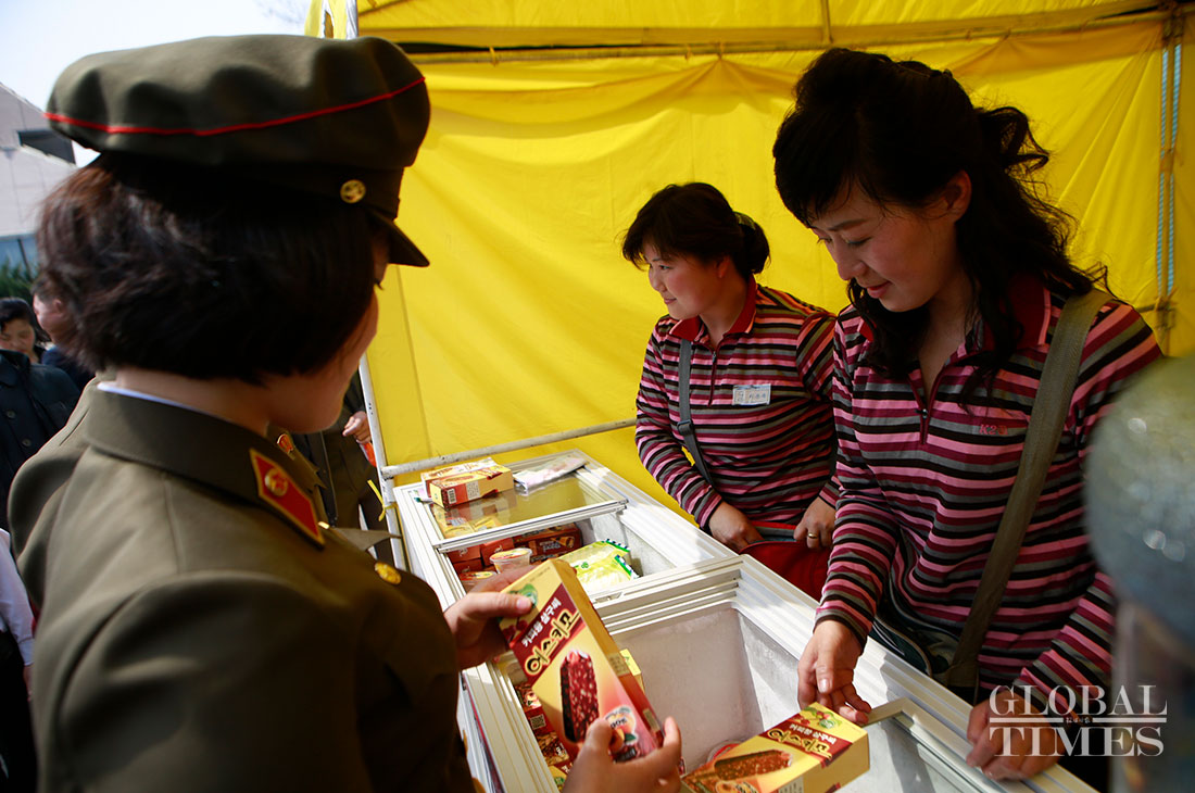Vendors sell ice cream and cold drinks near the Kim Il-sung Flower Show in Pyongyang on April 16. Photo: Li Hao/GT figcaption >