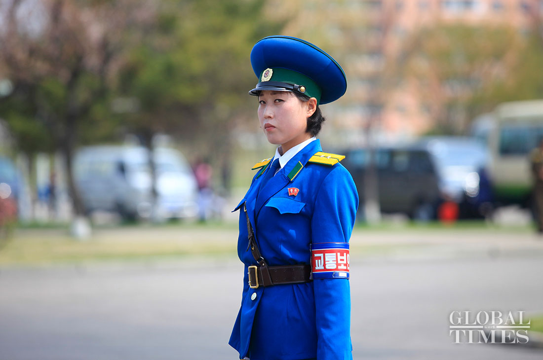 A North Korean policewoman stands guard in front of the East Pyongyang Grand Theatre on April 16. Photo: Li Hao/GT figcaption >
