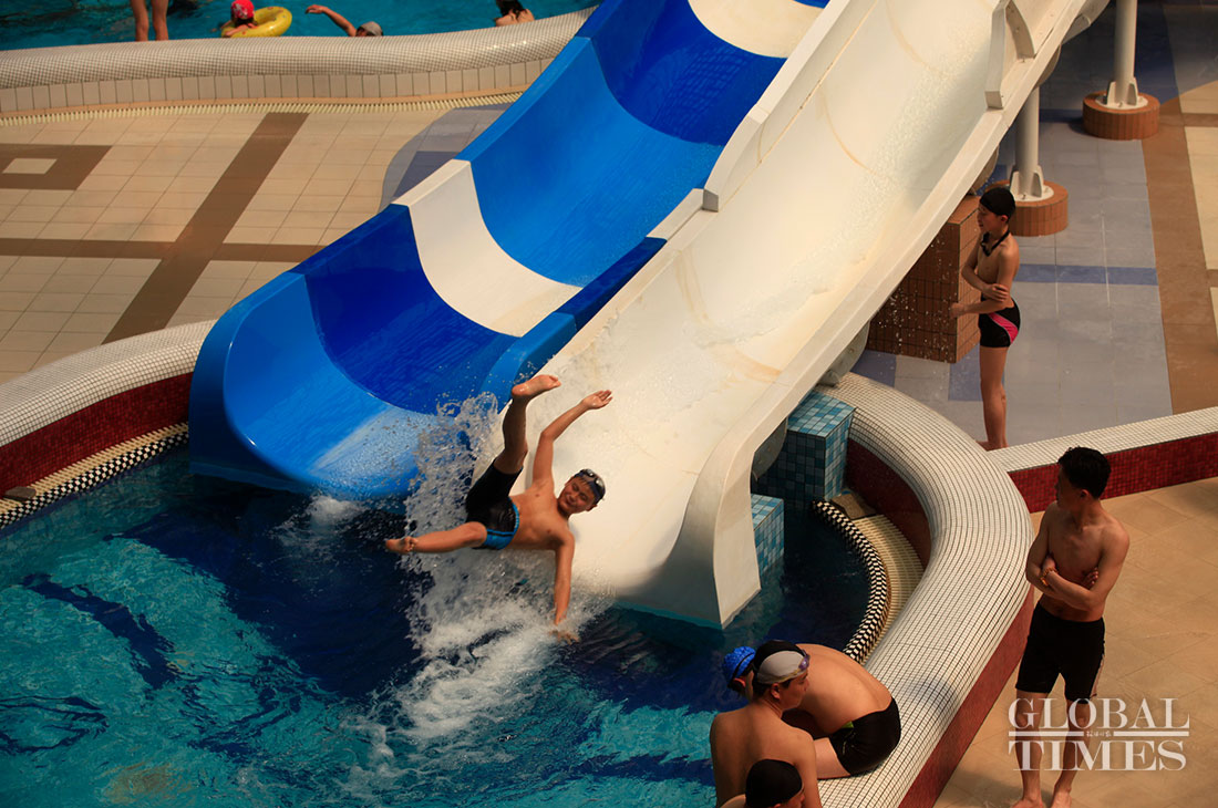 A North Korean enjoys a water slide at Pyongyang’s Munsu Water Park on April 16. The park occupies 120,000 square meters and boasts surfing facilities. Photo: Li Hao/GT figcaption >