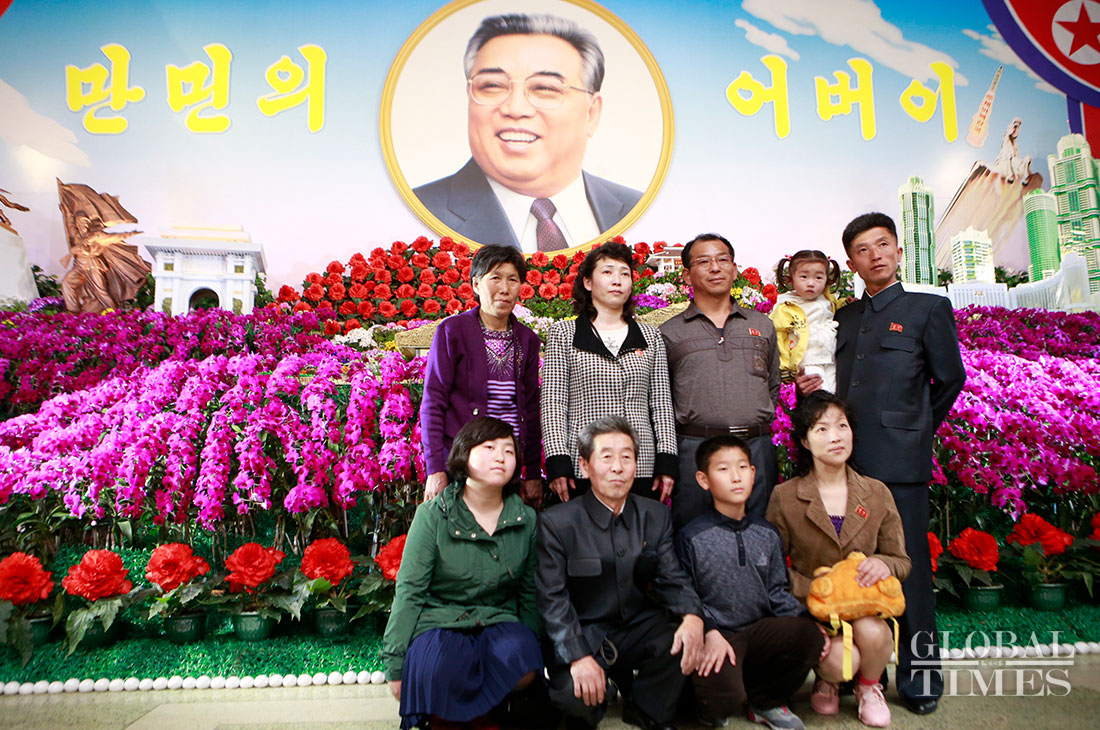 People take group photos at the Kim Il-sung Flower Show in Pyongyang on April 16. Photo: Li Hao/GT figcaption >