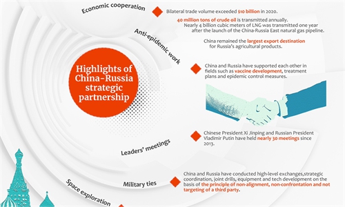 Highlights of China-Russia strategic partnership: -Nearly 30 meetings between the two countries' leaders since 2013 -Bilateral trade volume exceeded $10b in 2020 -A joint ...