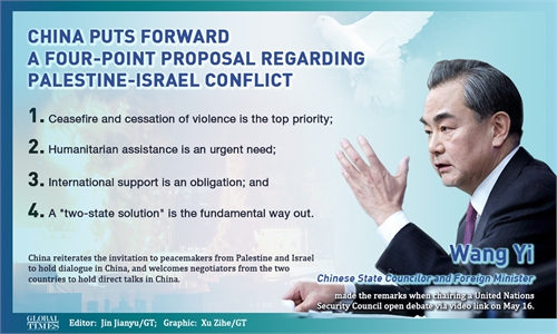 China puts forward a four-point proposal regarding escalating Palestine-Israel conflict, Chinese State Councilor and Foreign Minister Wang Yi said on Sunday.