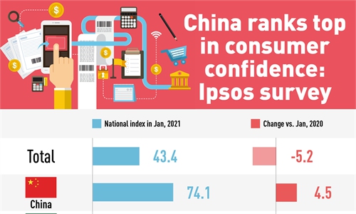 China ranked first with 74.1 points in an Ipsos consumer confidence index survey in Jan 2021, up 4.5 points from that of Jan 2020. ...