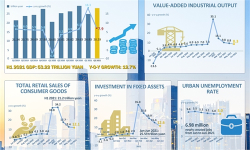 China's major economic data in H1 2025: GDP: up 5.3% y-o-y; Value-added industrial output: up 6.4% y-o-y; Retail sales: up 5% y-o-y; Fixed-asset investment: ...