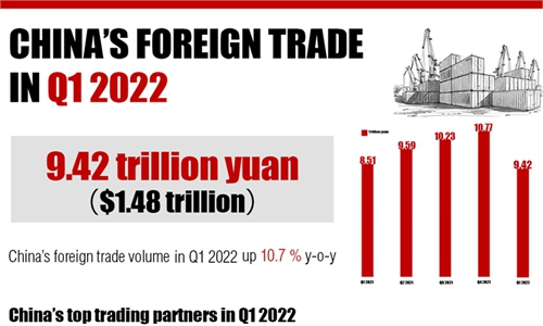 China's foreign trade went up 1.3 pct in Q1, reaching 10.3 trillion yuan ($1.41 trillion), a new record high compared to the same period ...
