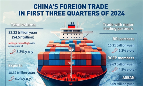 China's foreign trade in the first three quarters of 2024: -Reached 32.33 trillion yuan ($4.57 trillion), setting a record high with an increase of 5.3% ...