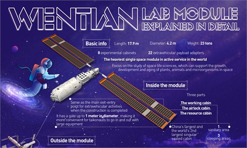 Weighing 23 tons at launch, Wentian consists of 3 parts: a working cabin, an airlock cabin & a resource cabin. It is heavier than ...