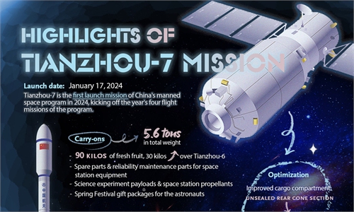 Tianzhou-7 is the first launch mission of China's manned space program in 2024, kicking off the year's four flight missions of the program.