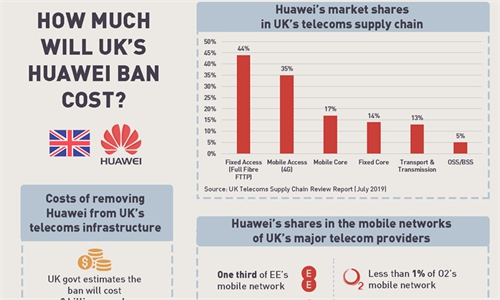 UK has banned its telecom providers from using Huawei equipment in #5G infrastructure, a move observers say may bring mobile blackouts in the country. Huawei accounts for large shares of the UK's mobile market. How much will the UK's ban cost? Check out this infographic: