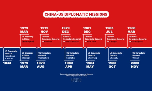 Since the establishment of diplomatic relations in 1979, China and the US have each set up five consulates in the other country. Chinese Consulate General in Houston, which the US ordered to close, was China's first Consulate General in the US.