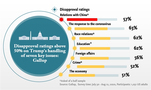 57% of respondents in the US disapprove of the way Trump handles relations with China, a recent Gallup survey, carried out between July 30 to Aug 12, showed. Click the graphic for more. Photo: GT