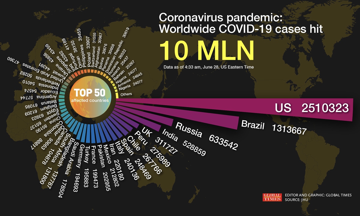 Global confirmed COVID-19 cases hit 10 million on June 28, according to John Hopkins University. US has the ...