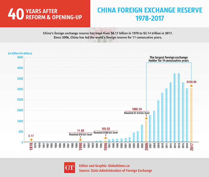 40 years after reform and opening-up: China's foreign exchange reserve has leapt from $0.17 billion in 1978 to ...