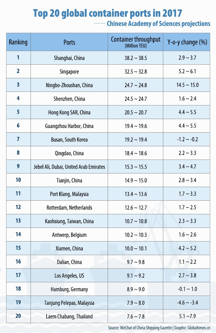 Half of world's top 20 container ports in 2017 are in China, according to a forecast report published ...