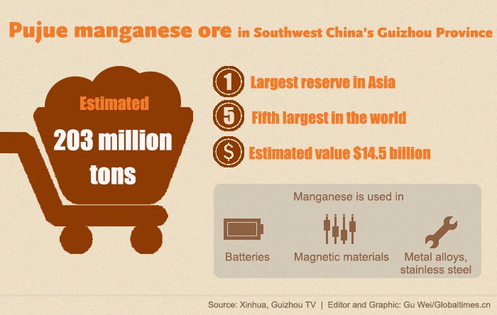 Asia's largest manganese ore reserve discovered in SW China's Guizhou Province, estimated output $14.5b.