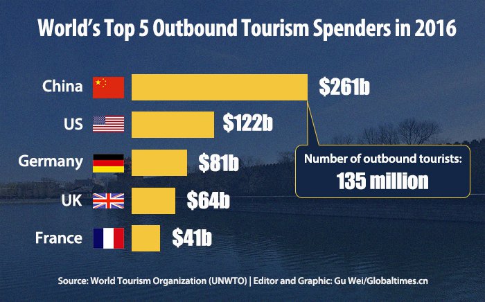 Chinese tourists spent $261 billion on tourism abroad in 2016, up $11 billion from 2015.