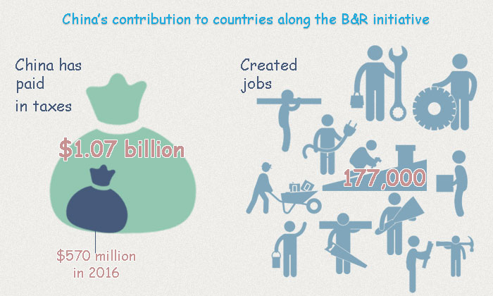 China has paid $1.07 billion in taxes ($570 million in 2016) and created 177,000 jobs in B&R countries. ...
