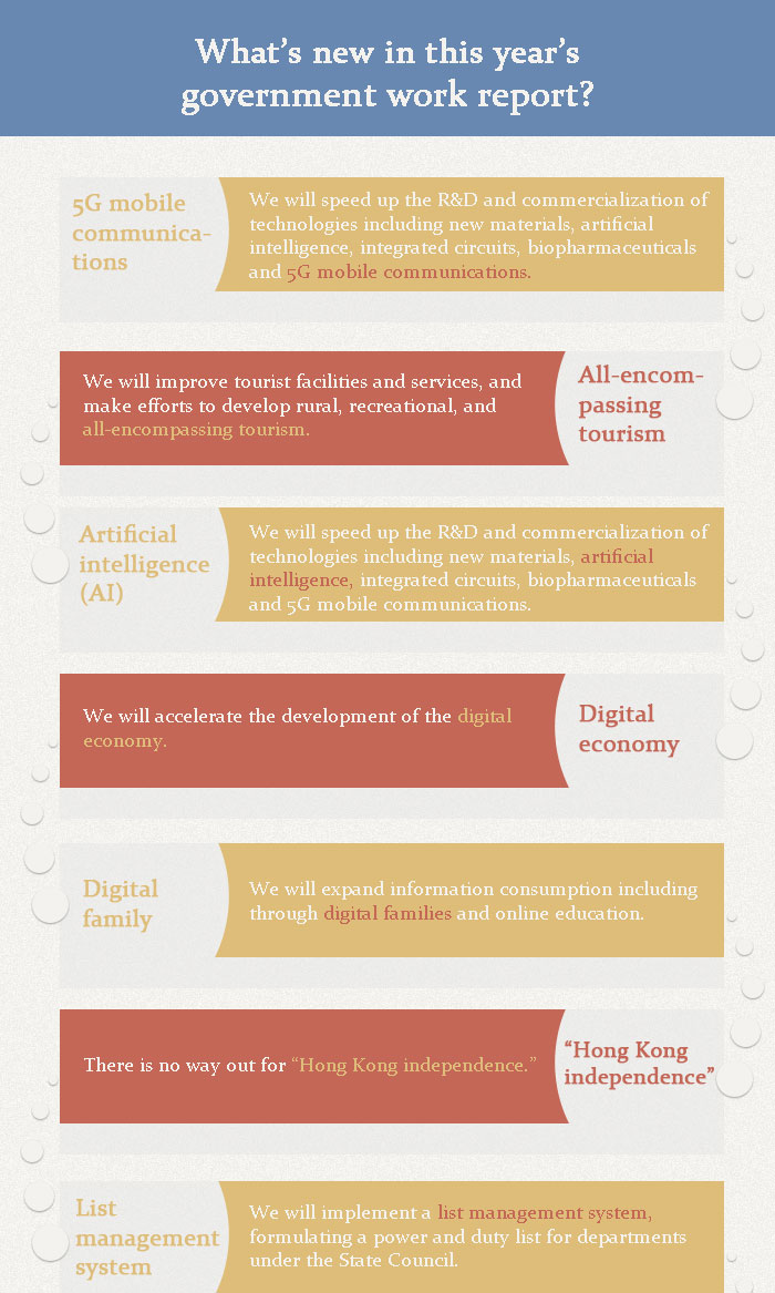 New phrases like AI, online education and “Hong Kong independence” debut in this year's government work report.