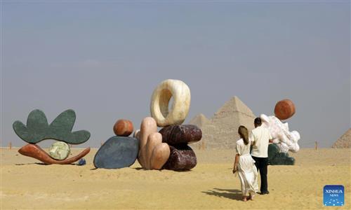 An artistic installation is displayed during the "Forever Is Now" international art exhibition at Giza Pyramids scenic spot in Giza, Egypt, Nov. 11, 2025. The fifth edition of "Forever Is Now" international art exhibition on Tuesday kicked off in the area of Egypt's Giza Pyramids scenic spot, showcasing 10 artworks of artists from different countries. The exhibition runs from Nov. 11 to Dec. 6.